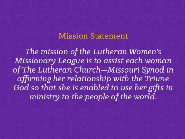 Vision Statement The LWML, the leading group for LCMS women, is the place where each woman is welcomed and encouraged to use her unique Godgiven gifts as she supports global missions and serves the Lord with gladness.