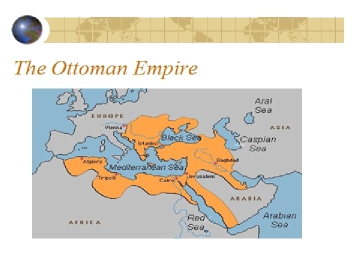 The beginning- The Ottoman Empire 1453 AD – End of the Roman Empire in the East. Sultan Mehmed II the Magnificent captures Constantinople, ending Byzantine Empire and consolidating Ottoman Empire in Asia Minor and Balkans. 15 th-16 th centuries - Expansion into Asia and Africa. 1683 - Ottoman advance into Europe halted at Battle of Vienna. Long decline begins. 19 th century - Efforts at political and economic modernisation of Empire largely founder. 1908 - Young Turk Revolution establishes constitutional rule and rules the Empire from 1913 -18 (rule of the three pashas) but degenerates into military dictatorship during First World War, where Ottoman Empire fights in alliance with Germany and Austria-Hungary.