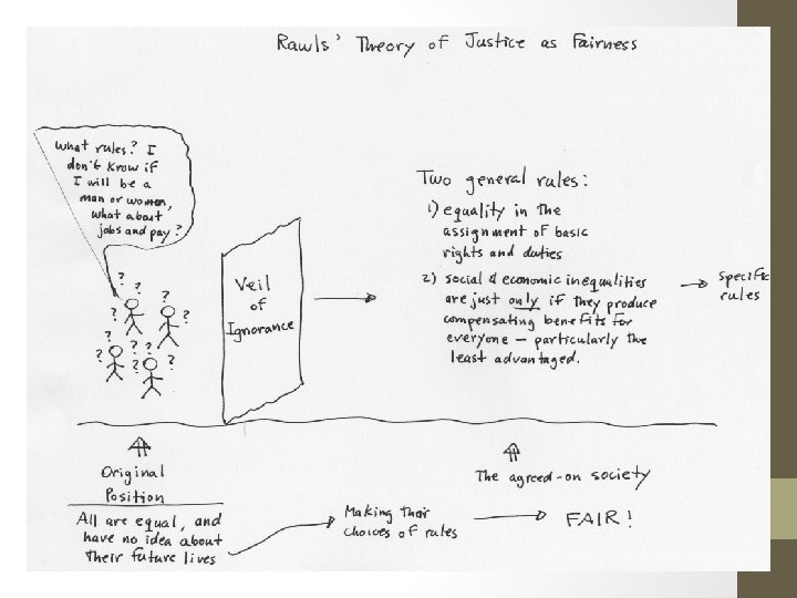 Rawls’ operational definition of “justice as fairness. ” • Think yourself back to the original position and put yourself behind the veil of ignorance. • Ask yourself whether a proposed rule for distributing benefits and burdens is acceptable to you. • If not, then it cannot be fair, and therefore it cannot be just – so, the rule must be rejected.
