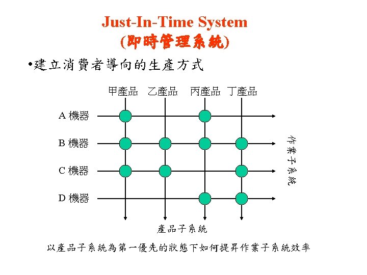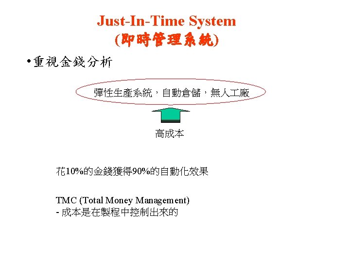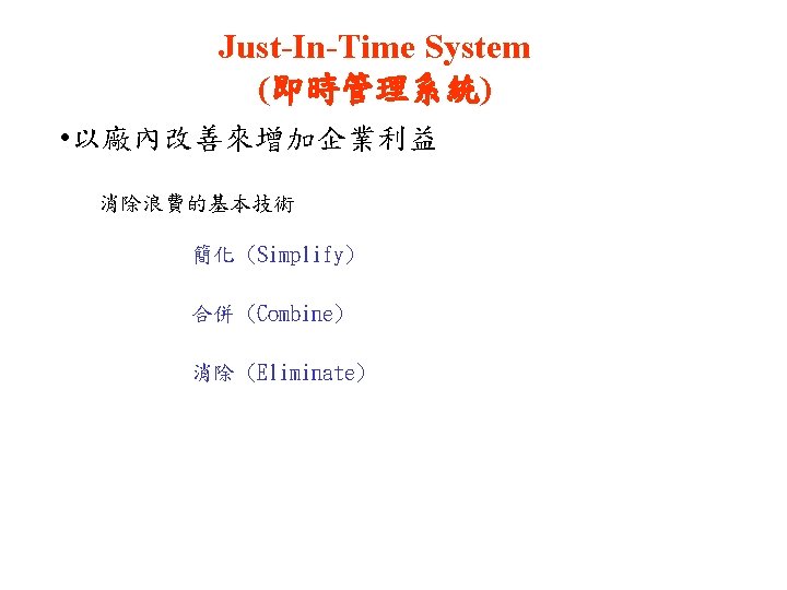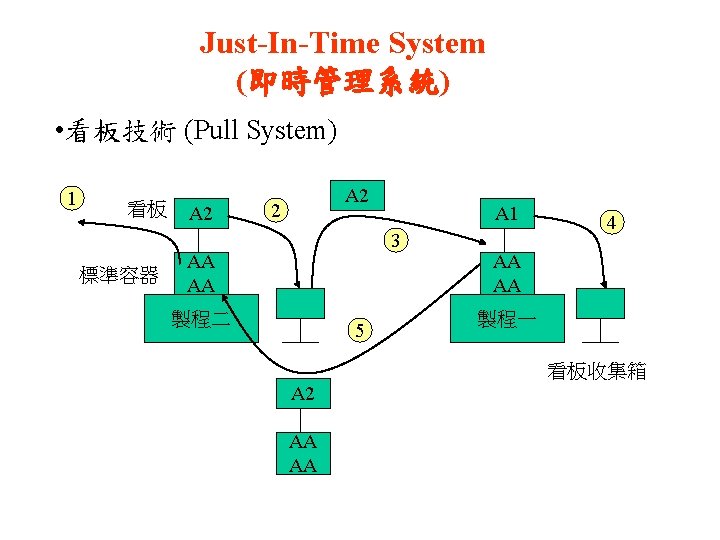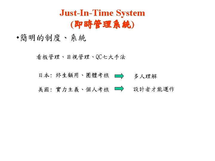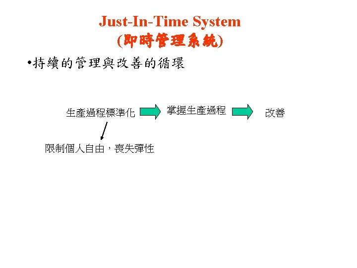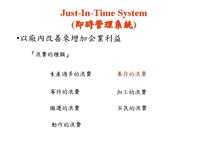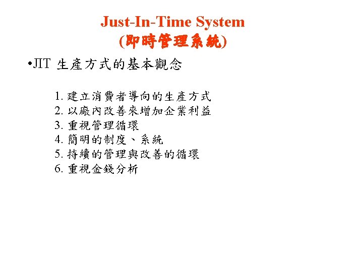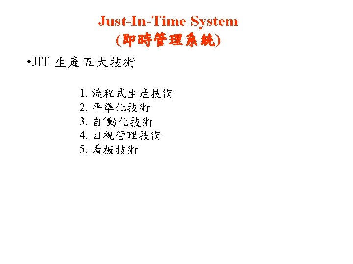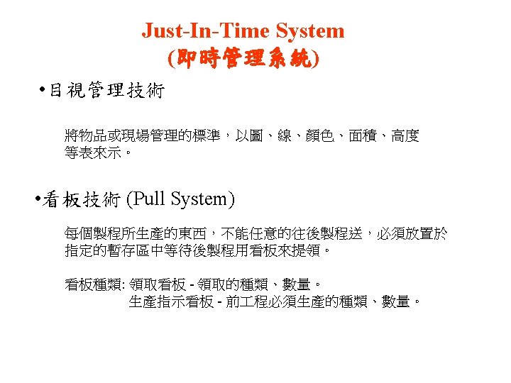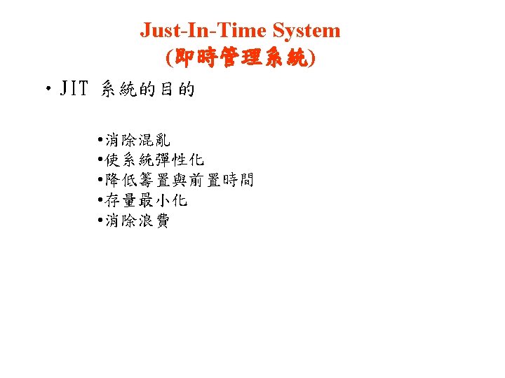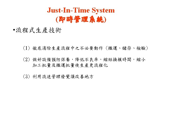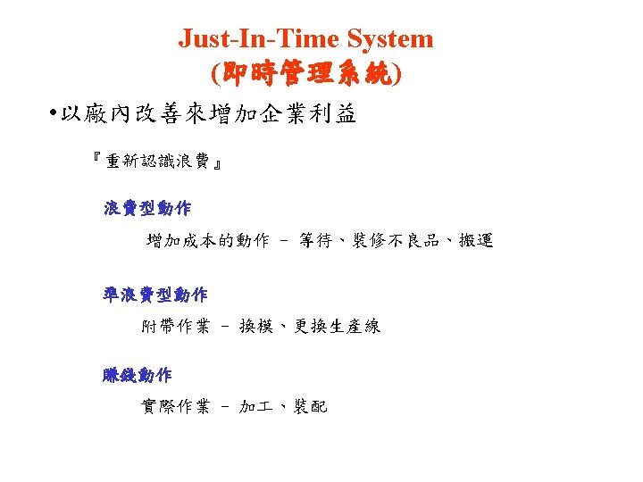 Just-In-Time System (即時管理系統) • Introduction The term just-in-time is used to refer to a production system in which both the movement of goods during production and deliveries from suppliers are carefully timed so that at each step of the process the next (usually small) batch arrives for processing just as the preceding batch is completed - thus, the name just-in-time. The result is a system with no idle items waiting to be processed, and no idle workers or equipment waiting for items to process. The JIP approach was developed at the Toyota Motor Company of Japan by Taiichi Ohno (大野耐一) and several of his colleagues.