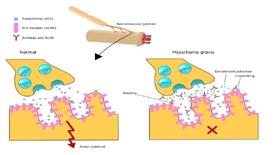 MYASTHENIA GRAVIS (MG) Autoimmune 5 -20 disease. per 100, 000, uncommon in children. Antibodies against postsynaptic membrane of the NMJ interfere with nerve impulse transmission leading to varying muscle weakness & fatigability. Antibodies against nicotinic acetylcholine receptors (ACh. R), musclespecific receptor tyrosine kinase (Mu. SK), or others.