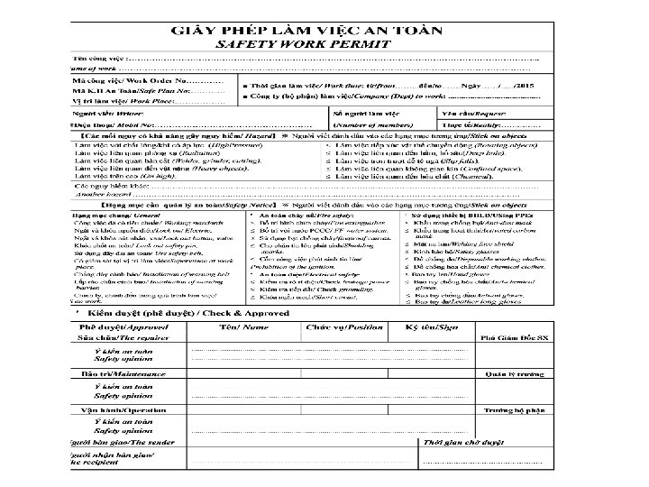 • - Phần của trưởng ban At ( Mr. Khuynh) Thực hiện các thủ tục Pháp lý. Kiểm tra tình trạng Công trường ( rào chắn, biển báo, hệ thống chiếu sáng, y tế, sắp xếp. . ) Soạn thảo giấy phép làm việc ( Biên bản, cam kết, tường trình , kiểm điểm, đề xuất…). Lên kế hoạch làm việc ( ngày, tuần , tháng, quý, năm ) Ghi chép nhật ký an toàn. Họp riêng bộ phận At, phân công các AT viên cụ thể, họp an toàn trước khi tiến hành công việc ). Báo cáo ATVSMT/PCCC hàng ngày, tuần , tháng , quý, năm cho cấp trên. Huấn luyện đào tạo cho những người mới tới làm việc Kiểm tra, đình chỉ, các thiết bị máy móc không đảm bảo an toàn, hết hạn sử dụng Tham gia thống kê, điều tra, báo cáo và quản lý các vụ tai nạn (nếu có) theo quy định hiện hành. Tham gia vào các cuộc họp giao ban kế hoạch, tiến độ thi công để chuẩn bị các phương án an toàn ( đi trước đón đầu không bị động) Tham gia góp ý về ATVSLD-MT y tế tại các cuộc họp với công nhân, người sử dụng lao động về xây dựng một công trường làm việc an toàn. Tổng hợp và đề xuất với người sử dụng lao động về các đề xuất, kiến nghị của công nhân, lãnh đạo cấp dưới, đoàn thanh tra, kiểm tra Tham gia , xây dựng vào việc thi đua, khen thưởng , xử lý, kỷ luật đối với cá nhân tập thể trong công tác ATVSLĐ/PCCC. Một số vấn đề phát sinh khác…