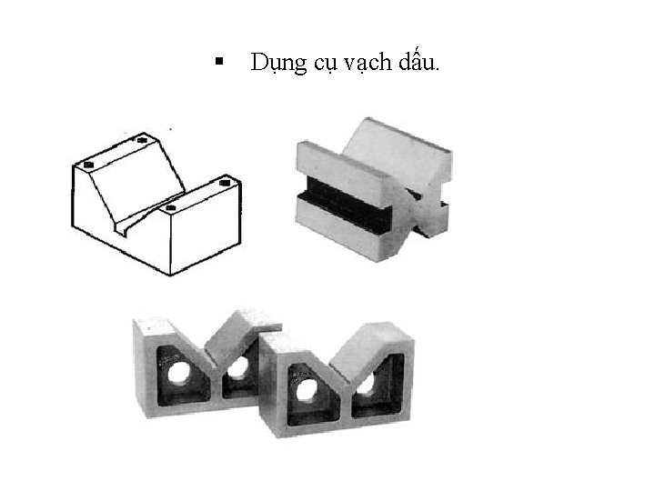 § Dụng cụ vạch dấu. • Bàn máp. • Khối V: Trong gia công cũng như trong vạch dấu, đối với những chi tiết có dạng tròn xoay, nếu đặt trên mặt phẳng (như bàn máp) thì vị trí của chi tiết không ổn định. Do đó đẻ định vị chi tiết khi gia công và khi vạch dấu người ta dùng dụng cụ gá đặt gọi là khối V.