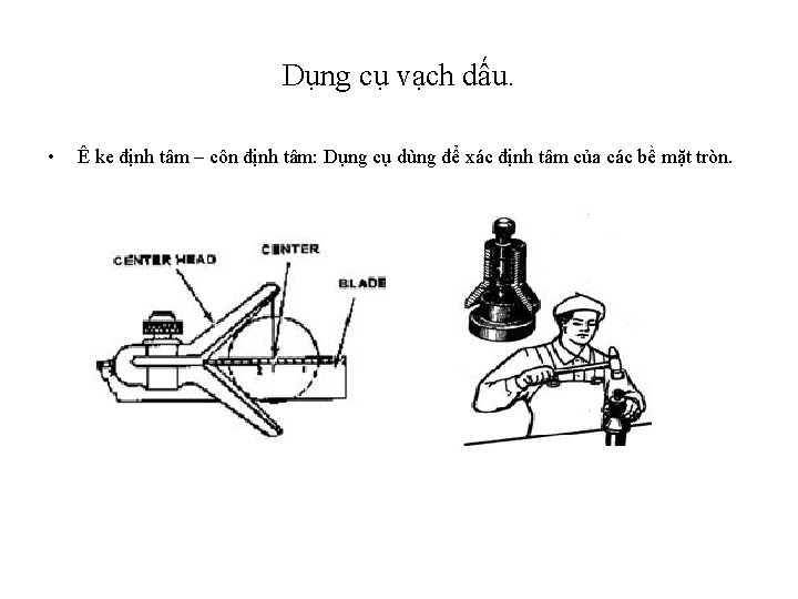 Dụng cụ vạch dấu. • Compa : Com pa là dụng cụ dùng để xác định các bề mặt có dạng cong, hoặc dùng để chia đều các khoảng cách.