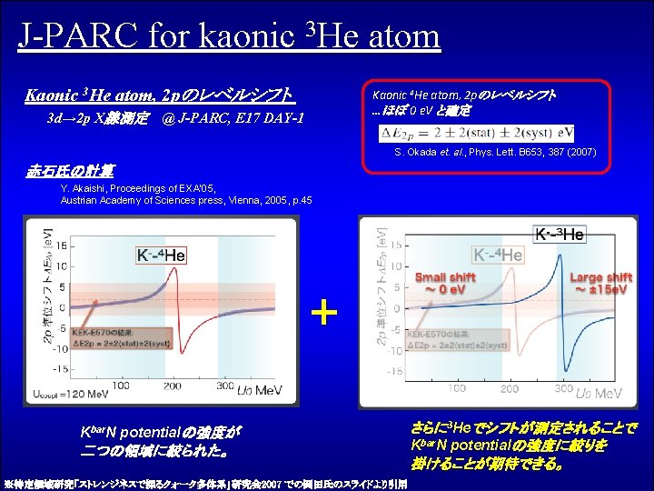 DEAR exp. for kaonic hydrogen atom G. Beer et al. , Phys. Rev. Lett. 94, 212302 (2005) Kaonic hydrogen atom, 1 sのレベルシフト @ DEAR Collaboration, DAΦNE, Frascati National Laboratories cf) KEK exp. M. Iwasaki et al. , Phys. Rev. Lett. 78, 3067 (1997) シフトの符号は同じだが、KEKの前回の実験(KpX)と重ならない KEK exp. DEAR Coupled channel chiral dynamics (Chiral unitary model) で DEARの結果を合わすのには苦労する。 かろうじてギリギリ合わせられる程度。。。 B. Borasoy et al. , Phys. Rev. Lett. 94, 213401 (2005)