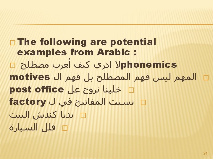 REASON OF CODE-MIXING � � � � � A. Interjection B. Quoting somebody else C. Expressing group identity D. Because of real lexical need E. Talking about a particular topic F. Repetition used for clarification G. Being emphatic about something H. To soften or strengthen request or command I. Intention of clarifying the speech content for interlocutor J. To exclude other people when a comment is intended for only a limited audience 23