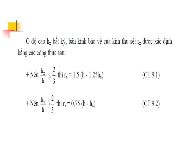 n n Vùng bảo vệ tạo ra giữa 2 cột thu lôi chỉ có tác dụng khi khoảng cách giữa hai cột là a phải nhỏ hơn 5 lần chiều cao thu lôi, tức là. Khi R sẽ lớn hơn 4 h, do đó ho = 4 h –r sẽ nhỏ hơn không (h<0), như vậy thì không còn vùng bảo vệ tương hỗ giữa hai cột thu lôi nữa mà trở về trường hợp hai cột thu lôi độc lập. Để bảo vệ những vật kéo dài như đường dây điện, đường dây thông tin, hoặc đường ống v. v. . . dùng dây chống sét (phần thu sét dạng dây) sẽ hợp lý hơn.