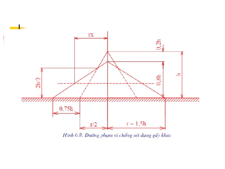 n n n Vùng bảo vệ của thu lôi : Mỗi cột thu lôi sẽ tạo ra xung quanh nó một vùng bảo vệ. Vùng bảo vệ của một cột thu lôi là một hình nón, đường sinh là đường gãy khúc, với đáy là hình tròn, bán kính h – chiều cao cột thu lôi ; - chiều cao công trình được bảo vệ ; - bán kính bảo vệ ở độ cao công trình ;