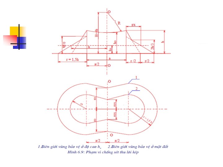 n n n Vùng bảo vệ của hai cột thu lôi. Để bảo vệ những công trình có mặt bằng lớn hoặc cụm công trình có thể làm nhiều cột thu lôi với độ cao không lớn thay cho một cột ở độ cao quá lớn. Cách xác định vùng bảo vệ như sau.