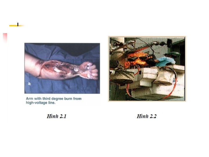 n n 4. Do bị phóng điện hồ quang. Đối với điện cao áp, sự nguy hiểm không những chỉ tiếp xúc va chạm vào nguồn điện mà khi một bộ phận nào đó của cơ thể người hoặc máy móc ở sát gần đường dây hoặc trạm biến áp có thể bị phóng điện hồ quang, gây bỏng cháy. Ở môi trường bình thường khoảng cách phóng điện là 30 k. V/cm, như vậy ở cấp điện áp 35 k. V ta đưa tay đến gần dây dẫn khoảng 1 cm thì sẽ phóng điện gây cháy tay.
