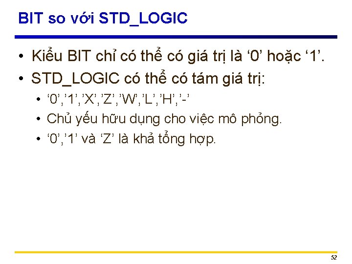 Kiểu STD_LOGIC Value Meaning ‘X’ Forcing (Strong driven) Unknown ‘ 0’ Forcing (Strong driven) 0 ‘ 1’ Forcing (Strong driven) 1 ‘Z’ High Impedance ‘W’ Weak (Weakly driven) Unknown ‘L’ Weak (Weakly driven) 0. Models a pull down. ‘H’ Weak (Weakly driven) 1. Models a pull up. ‘-’ Don't Care 53