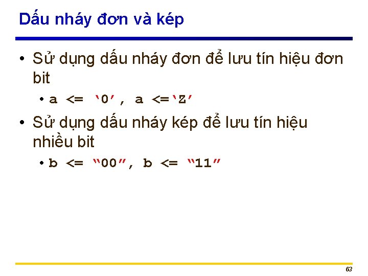 Các vector logic chuẩn SIGNAL SIGNAL a: b: c: d: e: f: STD_LOGIC; STD_LOGIC_VECTOR(3 DOWNTO 0); STD_LOGIC_VECTOR(7 DOWNTO 0); STD_LOGIC_VECTOR(15 DOWNTO 0); STD_LOGIC_VECTOR(8 DOWNTO 0); ………. a <= ‘ 1’; b <= ” 0000”; (nhị phân) c <= B” 0000”; ràng d <= ” 0110_0111”; e <= X”AF 67”; f <= O” 723”; -- Mặc định là cơ số 2 -- Cơ số 2 được chỉ ra rõ -- Sử dụng ‘_’ cho dễ đọc. -- Cơ số 16 (số hex) -- Cơ số 8 62