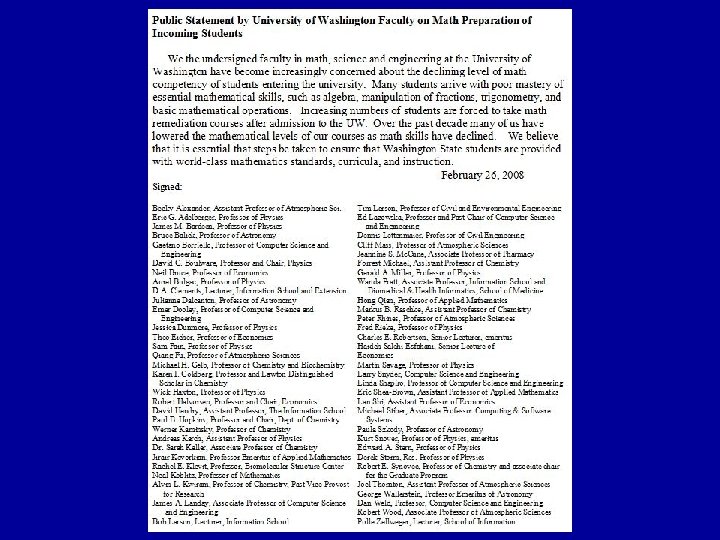 Not my opinion only… • The decline in math skills is universally noted by math and science faculty. • Two years ago, nearly 300 UW faculty members in the sciences and technical fields signed a petition stating this fact. • Most are “dumbing” down the math level of introductory classes. • Even majors are having problems.