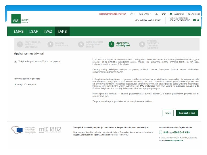 Privalumai Jei programos naudotojai pageidaus, bus informuojami, kokias mokesčių deklaracijas ir iki kada turi pateikti. Nereikės patiems apskaičiuoti ir pildyti ilgalaikio turto nusidėvėjimo duomenų. Nebereikės aiškintis ir kokios išlaidos yra priskiriamos leidžiamiems atskaitymams, kokios nepriskiriamos, o kurių priskyrimas yra ribojamas - tai nustatys programa pagal naudotojo įvestą išlaidų rūšį.