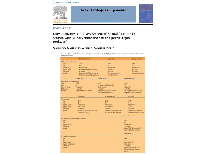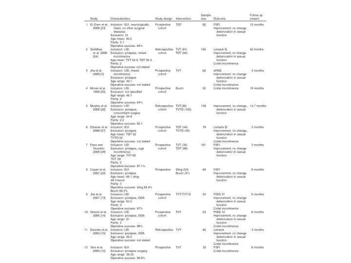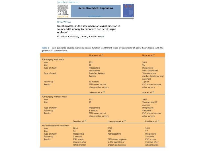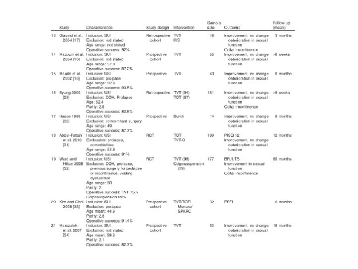 • • çoğunluğu kohort, randomize çalışmaları içeren toplam 21 çalışmayı inceleyen bir meta-analiz inkontinansı olan kadınlarda cinsel fonksiyonu değerlendirmek için – ya spesifik seksüel semptomları sorgulanmış – ya da sorgulama formlarından yararlanmıştır