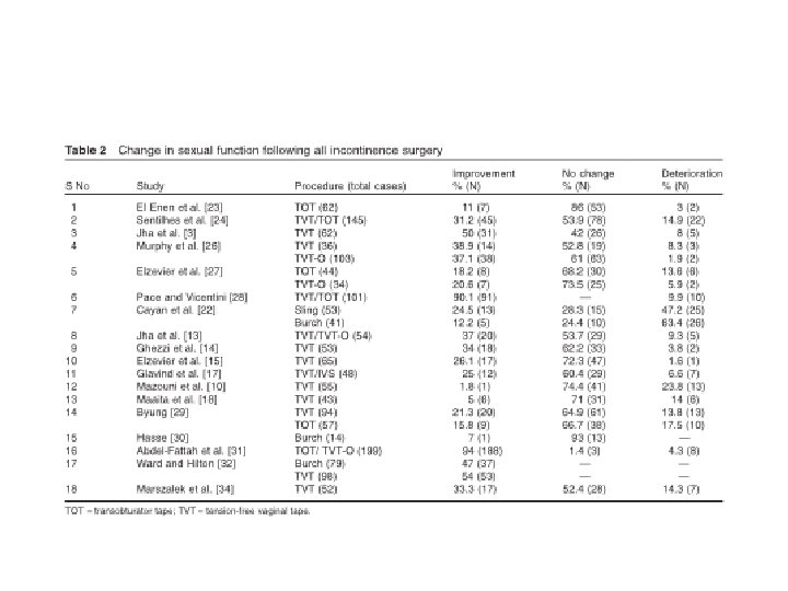 • 18 çalışma ve 1578 hastayı içeren değerlendirme • hastaların yarısından fazlasında (%55. 5) inkontinans cerrahisi sonrası genel cinsel semptomların değişmediği, • %31. 9’unda cinsel semptomlarda düzelme olduğu, • %13. 1 hastada ise kötüleşme olduğu rapor edilmiştir