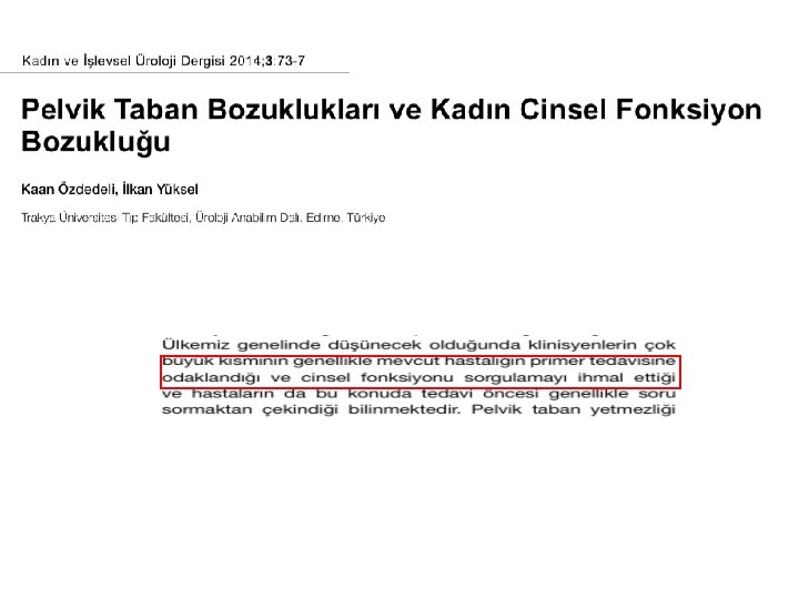 • U rojinekolojik sorunların cinsel sağlık u zerine etkileri – klinik o yku , – Buna ek olarak gec erlilik/gu venirlik c alışması yapılmış sorgulama formları sayesinde en iyi şekilde değerlendirilebilir. • POP/U İ ilişkisine o zgu n soru formları son 10 yıl ic inde oluşturulmuştur.