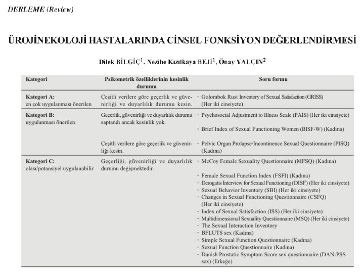 • Uluslararası Kontinans Birliği, yaygın olarak kullanılan cinsellik soru formlarını, uygulanabilirlik durumuna go re; – kategori A (en c ok uygulanması o nerilen), – kategori B (uygulanması o nerilen) ve – kategori C (olası/potansiyel uygulanabilir) olmak u zere u c şekilde kategorize etmiştir.