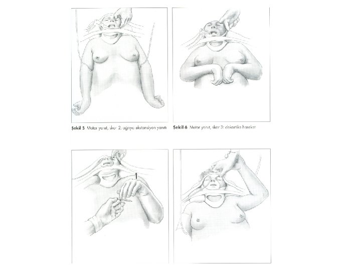 Glasgow Koma Skalası Göz Açma (E) Spontan Ses ile Ağrı ile Yok En iyi motor cevap (M) Emirlere uyar Ağrıyı lokalize eder Normal fleksiyon Anormal fleksiyon Ekstansiyon Yok Sesli cevap (V) Oriyente Konfüze Uygunsuz, anlamsız kelimeler Anlaşılmaz ses çıkarma Yok GKS: E+M+V (Max: 15 Min: 3) 4 3 2 1 6 5 4 3 2 1