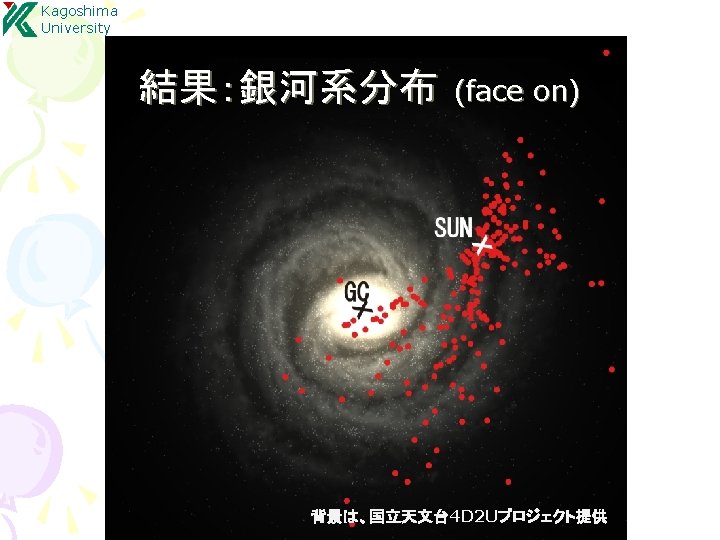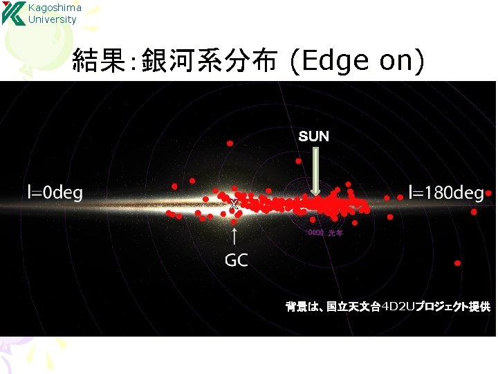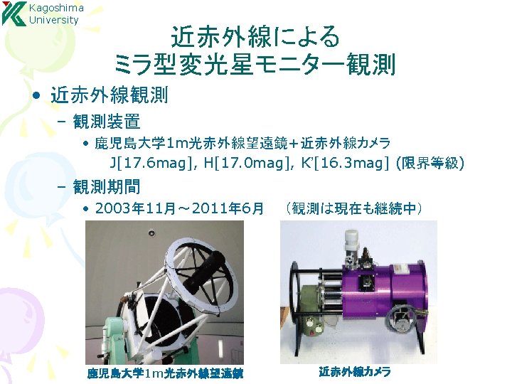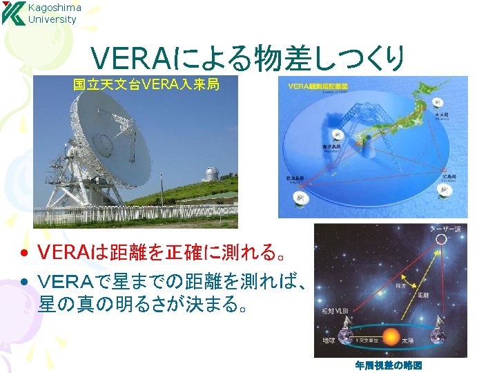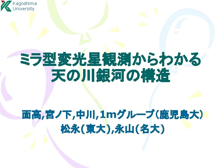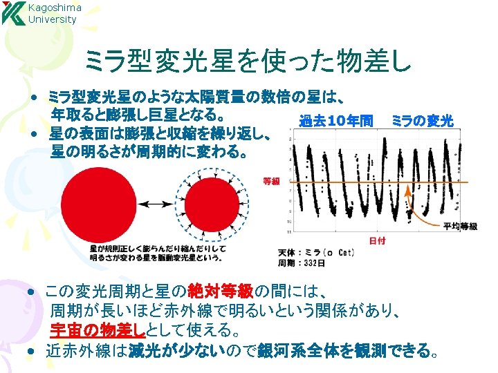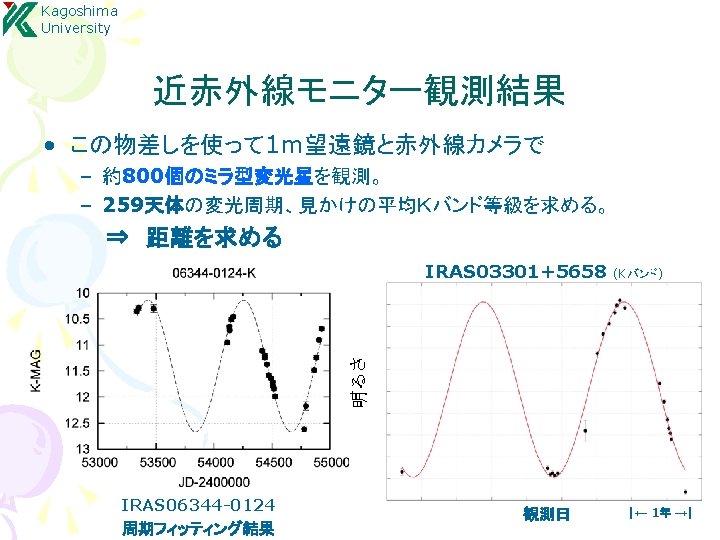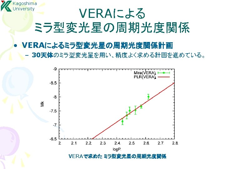 Kagoshima University 結果:年周視差による距離計測 S Crt, SY Scl, RX Boo, T Lep R. A. S Crt : Nakagawa et al. 2008 SY Scl : Nyu et al. 2012 Source S Crt T Lep R UMa SY Scl RX Boo Y Lib RW Lep U Lyn RX Boo : Kamezaki et al. 2012 R Aqr VLTI (ESO) Parallax [mas] err [%] 2. 33 3. 058 1. 72 0. 75 7. 31 0. 87 1. 62 1. 29 4. 7 0. 13 0. 042 0. 09 0. 03 0. 5 0. 08 0. 16 0. 08 0. 8 5. 6 1. 4 5. 2 4 6. 8 9. 2 9. 9 6. 2 17 De c. Time [day] T Lep : (Nakagawa in prep. )