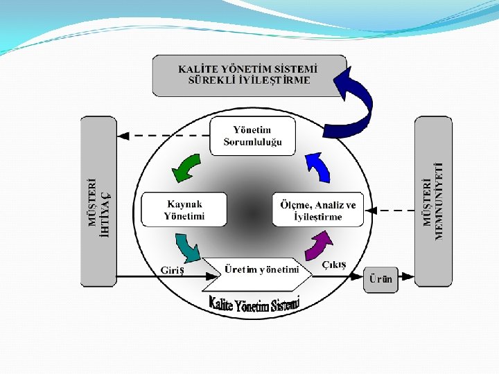 Kaliteye Dayalı Sistemlerinin Oluşturulması ve Kalite Sistem Dokümantasyonu Kalite sistemi dinamik bir yapı içerisinde oluşturulmaktadır. Sistemin hedefi müşteri tatminini sağlamak olarak belirlenmektedir (Müşteri anlayışı iç ve dış müşteri olarak ikiye ayrılmaktadır). Böyle bir sisteme hareket veren ilk adım olarak, gerekli dokümanların hazırlanması gösterilmektedir. 63