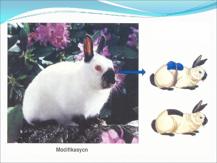 �Modifikasyona BESİN : Dişi arılar arı sütü ile beslenirse� kraliçe arı , neden olan faktörler �çiçek tozu (polen) ile beslenirse işçi arılar oluşur. � �IŞIK: Işık olmadığı zaman bitkilerde klorofil oluşmaz. Bitki beyaz renkli (Albino )olur. � �SICAKLIK: İnsan derisinin yazın bronzlaşması. � �TOPRAK: Ortanca çiçekleri asitli toprakta kırmızı. �bazik toprakta� mavi çiçek açar. � �BASINÇ: Karahindiba bitkisi dağda yetişirse kısa boylu, �ovada yetişirse� uzun boylu olur.