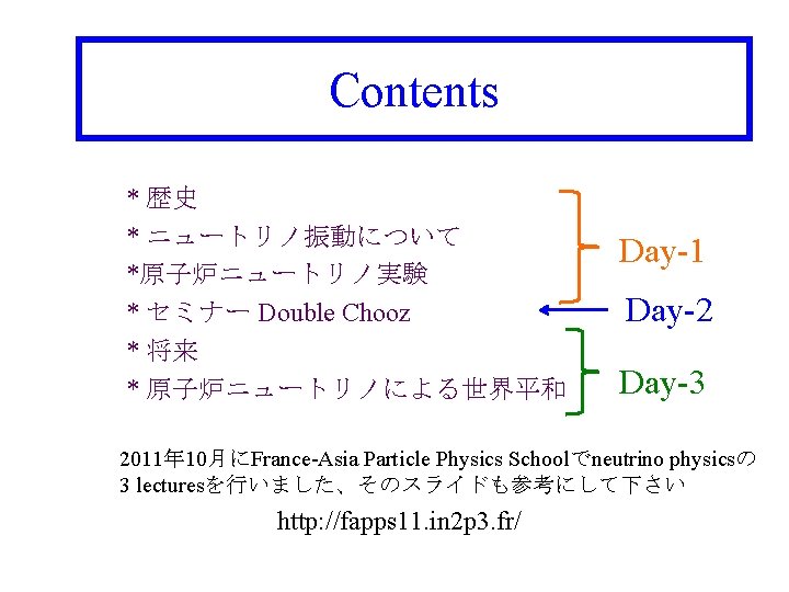 世界の研究状況 = Applied Antineutrino Physics Workshops = (応用反ニュートリノ物理研究会) 1 st: 2004/2/ 2 nd: 2005/12/ 3 rd: 2006/9/ 4 th: 2007/12/ 5 th: 2009/4/ 6 th: 2010/8/ 7 th: 2011/9/ @ハワイ大学, USA @ハワイ大学, USA @ ローレンスリバモア国立研究所, USA @APC, フランス @ Angra, ブラジル @東北大,日本 @ウイーン,オーストリア IAEA主催のワークショップ 1 st: 2003/12/ "Meeting to Evaluate Potential Applicability of Antineutrino Detection Technologies for Safeguards Purposes". 2 nd: 2008/10/ "Focused Workshop on Antineutrino Detection for Safeguards Applications" 3 rd: 2011/9/"ad hoc Working group meeting on safeguard application of Antineutrino Detectors"
