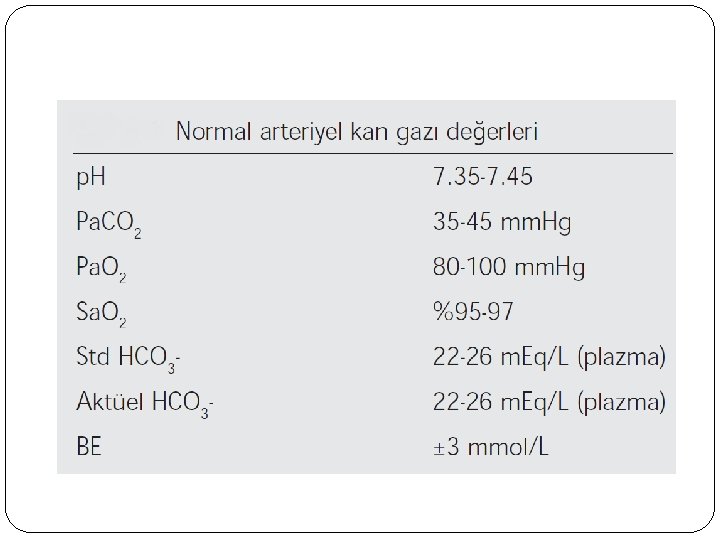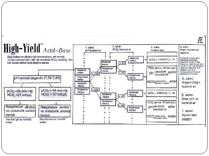 Arter Kan Gazının Sistematik Yorumlanması Eğer primer bozukluk metabolik aisdoz/alkakoz olarak tespit edilmişse beklenen Pa. CO 2 hesaplanır. Metabolik Asidoz Beklenen Pa. CO 2=1, 5 x. HCO 3+8 Ölçülen değer beklenen değerden düşükse eşlik eden solunumsal alkaloz mevcuttur. Ölçülen değer beklenen değerden yüksekse eşlik eden solunumsal asidoz mevcuttur.