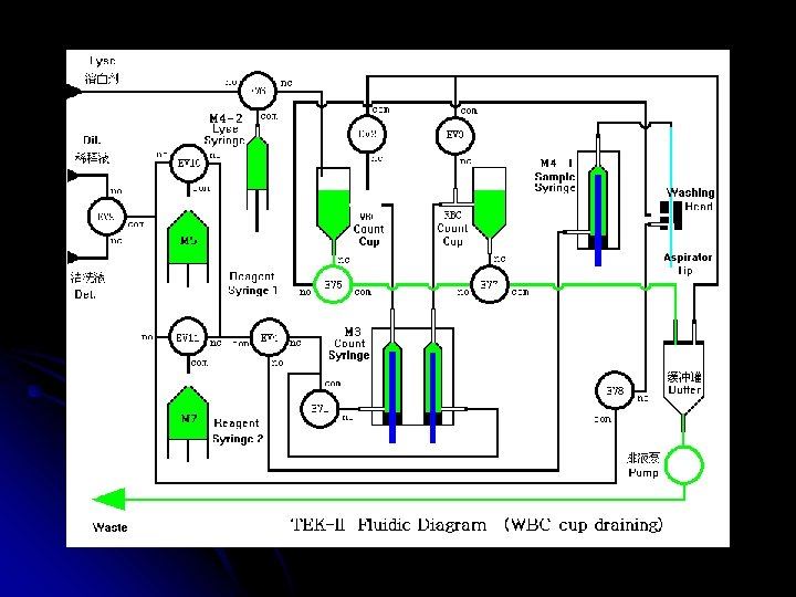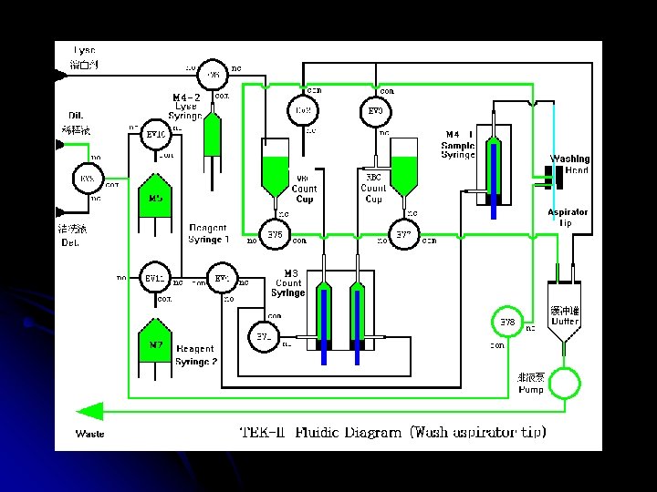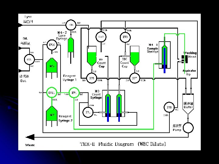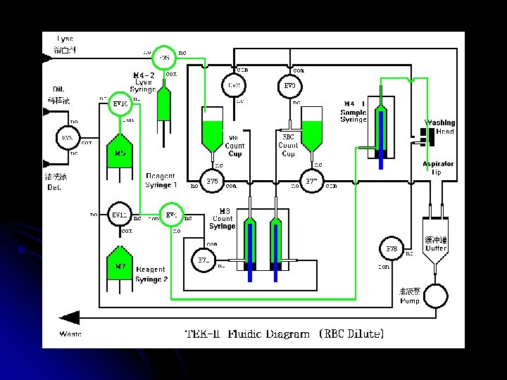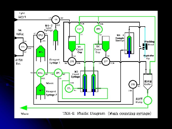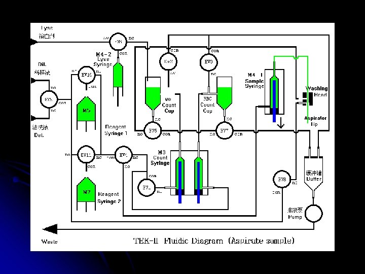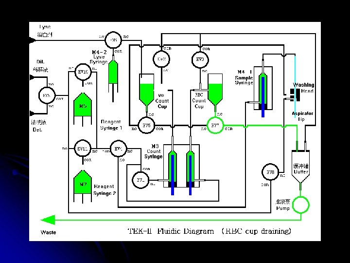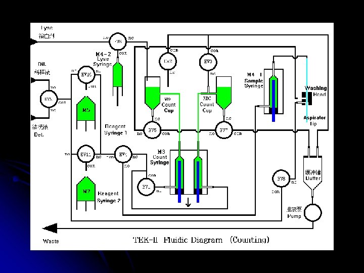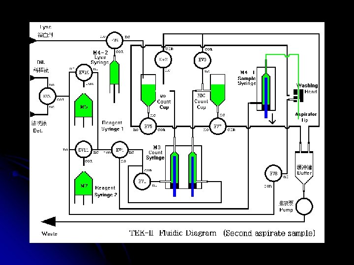 TEK-II ÇALIŞMA ŞEKLİ Tekom hematoloji analizörüdür. Hasta kanı ile çalışır. Alınan numune cihazın probuna verilir , kola basılır ve prob cihaz için yeterli kanı içeri alır. Cihazın içinde 2 ayrı küvet vardır ve bu küvetlerin içinde de 2 ayrı milimetrelik delik vardır (aparture). Bazı moleküller buradan geçip geçemiyeceği yöntemiyle sayılır. Bir kısmı , cihazdan gelen reaktifler sonucu parçalanarak sayılır, diğer bi kısmı da yine reaktifler sonucu boyanır ve lazer yöntemiyle sonucuna bakılır. Cihaz bu şekilde sonuçları elde eder.