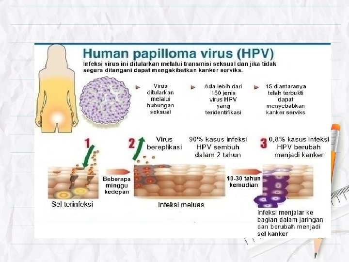 Apa penyebab Kanker Serviks? KANKER SERVIKS DISEBABKAN OLEH HUMAN PAPILLOMAVIRUSa, 1, 2 120 Tipe HPV telah diketahui 30 -40 Tipe HPV menyerang anogenital Low risk type ( HPV 6 & 11 ) (tidak menyebabkan kanker) Menyebakan anogenital warts High risk type ( HPV 16 & 18) Menyebabkan kanker serviks Anogenital : area kelamin (termasuk kulit penis, mulut vagina & anus) Infeksi dengan HPV seringkali TIDAK menimbulkan gejala Banyak orang TIDAK tidak tahu mereka terinfeksi HPV Banyak orang dapat menularkan HPV TANPA menyadarinya
