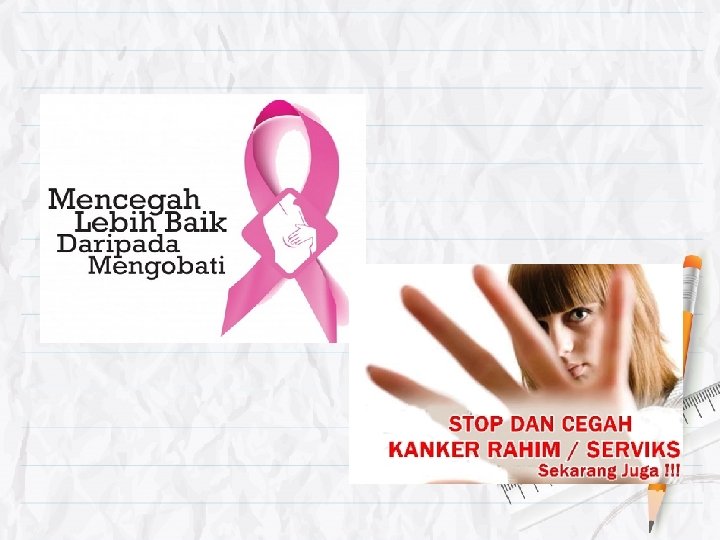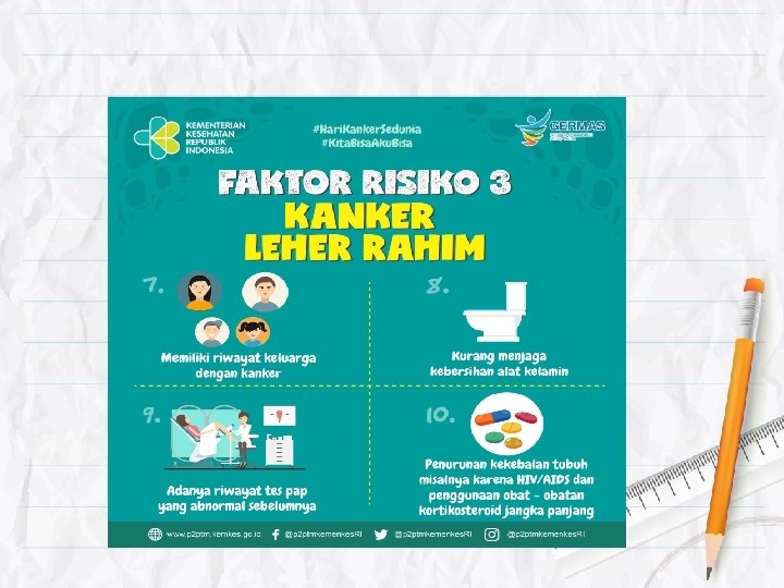 Mengapa skrining kanker serviks PENTING? ? ? • Kanker serviks merupakan pertumbuhan dari suatu kelompok sel yang tidak normal pada serviks (leher rahim). • Perubahan ini biasanya memakan waktu beberapa tahun sebelum berkembang menjadi kanker. • Terdapat kesempatan yang cukup lama untuk mendeteksi apabila terjadi perubahan pada sel serviks melalui skrining (pap smear) dan menanganinya sebelum menjadi kanker serviks.