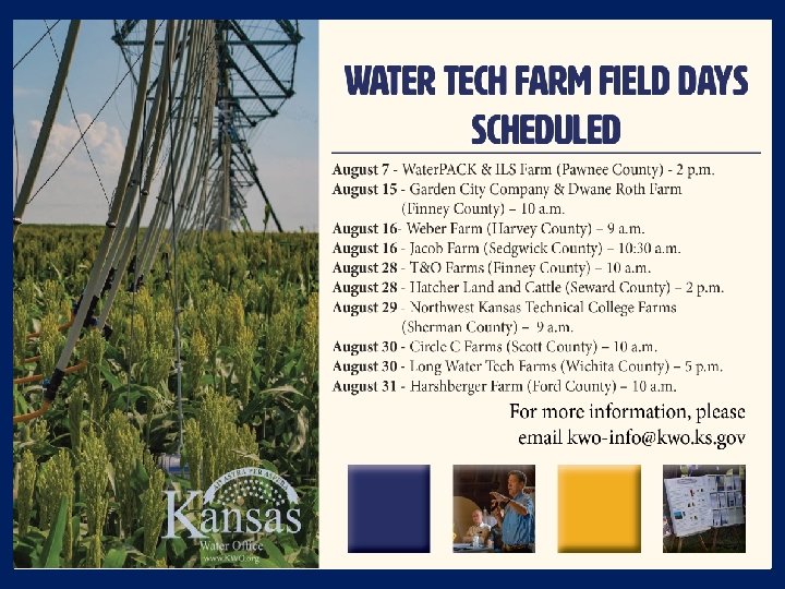WCA Name Water Conservation Areas County The Garden City Company FI/KE Ray Smith GL/WA Fansher Farms FI Larry Goss Farm FI Hayden Family Farms SH R&R Unruh Farms FI/KE Big D Farms FI Richmeier Farms FI Hatcher Land Co. LP SW Compton: Lane County Farm LE Wichita County WH Compton: Highway 4 Farm SC Total Period 2017 -2021 2017 -2026 2017 -2021 2018 -2017 -2021 2017 -2021 2017 -2019 2017 -2031 Acres Enrolled 7, 170 1, 479 1, 246 432 800 1, 613 2, 790 597 252 288 10, 673 649 27, 989 Water Date Savings Approved (Af) 943 5/8/2018 87 4/6/2018 171 3/29/2018 89 2/19/2018 85 1/26/2018 248 1/26/2018 253 9/5/2017 129 8/25/2017 19 7/31/2017 38 3/30/2017 2, 226 3/7/2017 97 2/20/2017 2, 323 • Level of conservation ranges from 10 -29% of average water use in approved plans • Multi-year allocations • Flexibility to move water between enrolled water rights • Totally voluntary