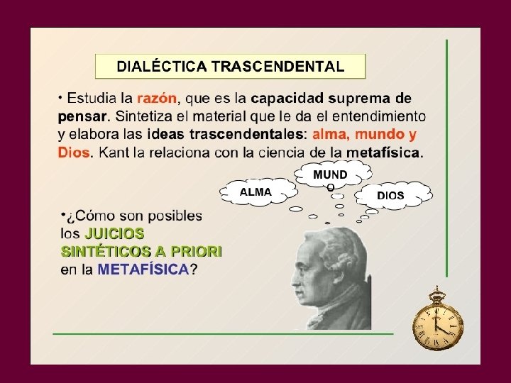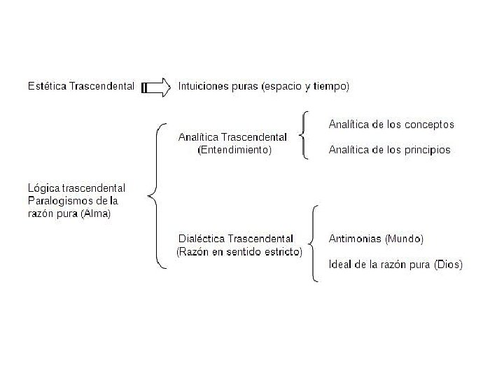 *Paralogismos y antinomias de la razón pura Antinomias: Según Kant, cuando aplicamos las ideas de la razón pura a la cosmología aparecen antinomias o proposiciones que son, a la vez, falsas y verdaderas. Por ejemplo: La afirmación de que el mundo tiene un comienzo en el espacio y en el tiempo a) Si esto fuera verdad, el espacio y el tiempo tendrían que provenir de una nada anterior, lo que supondría la antítesis de lo que se quería demostrar: que el mundo no tiene comienzo en el espacio y en el tiempo. b) Pero, si esto último fuera verdad, no podría hablarse de un acontecer en el universo, acontecer que requeriría un comienzo y un fin. Paralogismos: Por paralogismos entiende Kant falsas conclusiones que surgen cuando aplicamos las ideas puras de la razón a la psicología racional. Son proposiciones que no tienen como materia una intuición sensible, por lo que trascienden la posibilidad de toda experiencia. Un paralogismo es confundir la unidad del Yo pienso con la unidad trascendental del yo como substancia simple y como personalidad (alma).