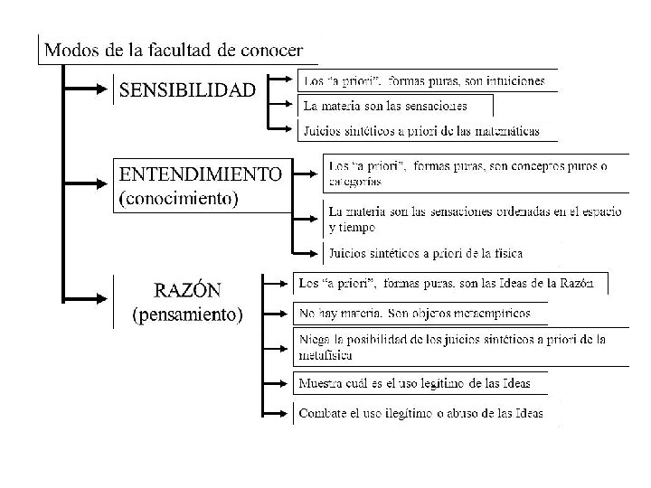 Cuadros-resúmenes de CRP Capítulo Facultad Estructuras a priori = formas puras Ejemplos Materia prima y producto Conocimiento Estética trascendental Sensibilidad Intuiciones puras = formas a priori de la sensibilidad Espacio y tiempo Sensación Juicios sintéticos a priori en Matemáticas Conceptos puros o categorías(12) = formas a priori del entendimiento Causa y efecto; sustancia y accidente; Necesidad y contingencia… Analítica Trascendental Dialéctica trascendental Entendimiento Razón Fenómeno Conceptos puros Ídem del entendimiento o categorías(12) Sensaciones espaciotemporales Juicios sintéticos a priori en Física Juicios científicos Sin objeto empírico Ideas puras de la Razón • Alma • Mundo • Dios Metafísica (Juicios sintéticos a priori = no es una ciencia)