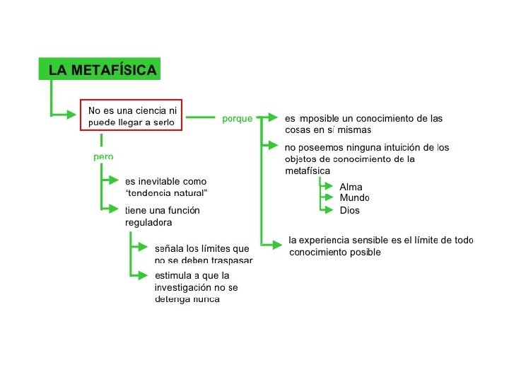 CRÍTICA DE LA RAZÓN PURA: CONCLUSIONES ACERCA DE LA METAFÍSICA 1ª conclusión: LA METAFÍSICA ES IMPOSIBLE COMO CIENCIA § Para que se pueda decir que un juicio es científico, un contenido que proceda de la experiencia tiene que ser unificado bajo una de las categorías del entendimiento § PERO los contenidos de la metafísica (alma, mundo y Dios)… … no poseen ningún contenido empírico … son conceptos puros de la razón = ideas trascendentales § Luego en la metafísica nos son posibles los JSP y aquella no es pues posible como ciencia, porque no habla de cosas que se manifiestan en la experiencia 2ª conclusión: LAS IDEAS DE LA RAZÓN, AL MARGEN DE SU NULO VALOR COGNOSCITIVO, TIENEN UN USO NORMATIVO Las ideas trascendentales: al no proceder de ninguna intuición sensible, al no hacer referencia a lo fenoménico, no nos pueden ofrecer conocimiento objetivo, sino que encuentra paralogismos y antinomias. sin embargo, la razón se empeña en esta ilusión del conocimiento, por lo que: a) Podemos deducir que es una tendencia natural no cognoscitivo b) En tanto tendencia natural, tiene algún tipo de valor sí un uso normativo b. 1. Las ideas trascendentales nos señalan los límites que el conocimiento no puede traspasar b. 2. Las ideas son “esquemas” que sirven para: - Dotar de unidad y orden a la experiencia (aún sin conocimiento del mismo) - Estimular al hombre a seguir buscando el sentido último de la realidad, a la vez que fija un límite donde detenerse (el límite del conocimiento = la experiencia posible)