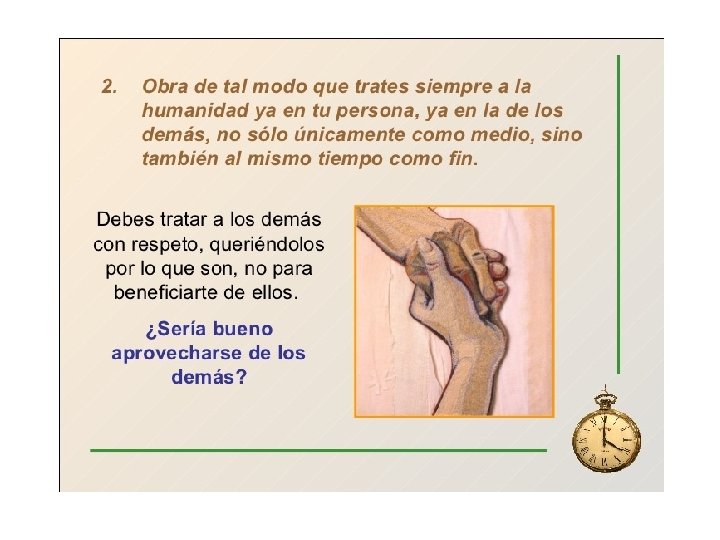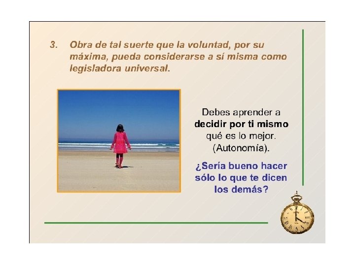 4. Clasificación de los principios prácticos. q Máximas - Principios prácticos que se aplican a casos particulares - Son subjetivas (sólo válidas para aquel que la sostiene) q Imperativos - Expresan la necesidad objetiva de una acción = cómo debe hacerse algo desde el punto de vista racional - Son válidos para todos los seres racionales - Tipos de imperativos: • HIPOTÉTICOS = sirven para alcanzar determinados objetivos • CATEGÓRICOS = válidos incondicionalmente (al margen de sus efectos) desde un punto de vista racional. Sólo estos son leyes morales 5. EL IMPERATIVO CATEGÓRICO KANTIANO. Tres definiciones (“Fundamentación”) a/ “Obra solo según una máxima tal que puedas querer al mismo tiempo que se convierta en una ley universal”. b/ “Obra de tal manera que uses a la humanidad, tanto en tu persona como en la persona de cualquier otro, siempre como un fin y nunca solamente como un medio”. c/“Obra de forma autónoma, conforme a tu voluntad, sin estar condicionado”.