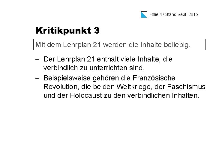 Folie 4 / Stand Sept. 2015 Kritikpunkt 3 Mit dem Lehrplan 21 werden die Inhalte beliebig. - Der Lehrplan 21 enthält viele Inhalte, die verbindlich zu unterrichten sind. - Beispielsweise gehören die Französische Revolution, die beiden Weltkriege, der Faschismus und der Holocaust zu den verbindlichen Inhalten.