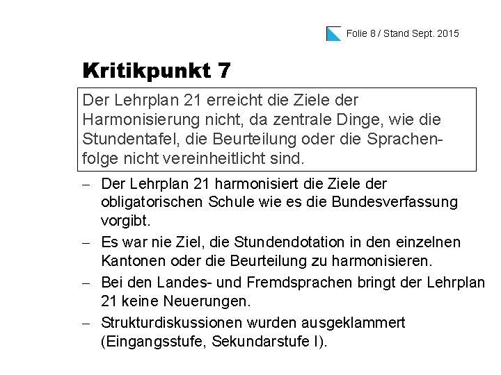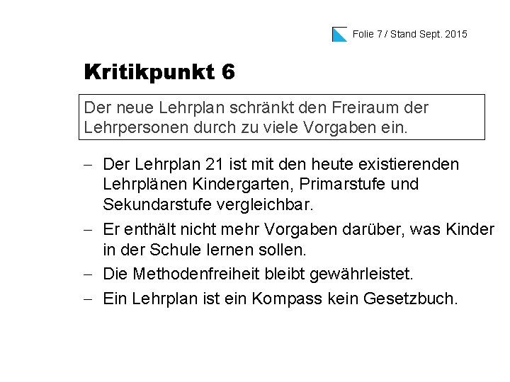 Folie 7 / Stand Sept. 2015 Kritikpunkt 6 Der neue Lehrplan schränkt den Freiraum der Lehrpersonen durch zu viele Vorgaben ein. - Der Lehrplan 21 ist mit den heute existierenden Lehrplänen Kindergarten, Primarstufe und Sekundarstufe vergleichbar. - Er enthält nicht mehr Vorgaben darüber, was Kinder in der Schule lernen sollen. - Die Methodenfreiheit bleibt gewährleistet. - Ein Lehrplan ist ein Kompass kein Gesetzbuch.