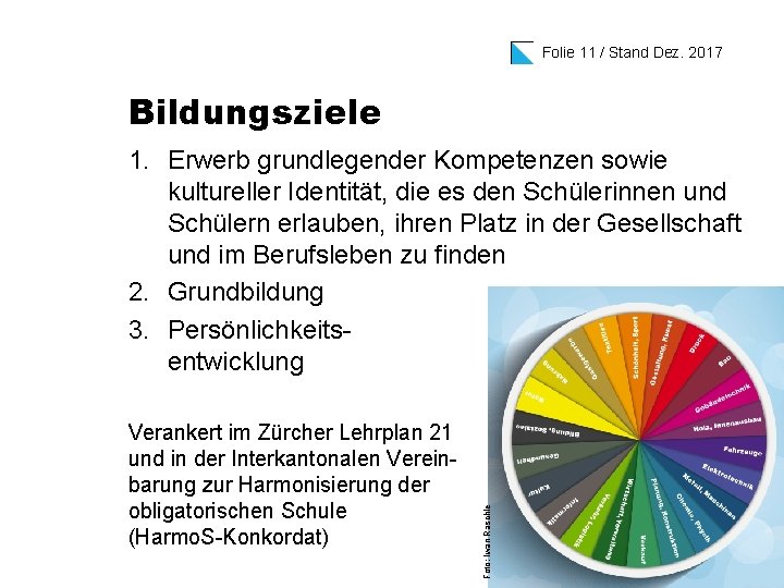 Folie 11 / Stand Dez. 2017 Bildungsziele Verankert im Zürcher Lehrplan 21 und in der Interkantonalen Vereinbarung zur Harmonisierung der obligatorischen Schule (Harmo. S-Konkordat) Foto: Iwan Raschle 1. Erwerb grundlegender Kompetenzen sowie kultureller Identität, die es den Schülerinnen und Schülern erlauben, ihren Platz in der Gesellschaft und im Berufsleben zu finden 2. Grundbildung 3. Persönlichkeitsentwicklung