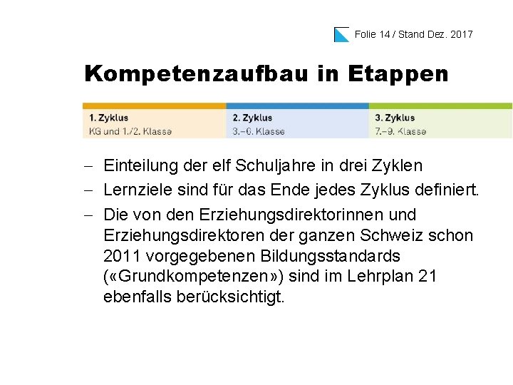 Folie 14 / Stand Dez. 2017 Kompetenzaufbau in Etappen - Einteilung der elf Schuljahre in drei Zyklen - Lernziele sind für das Ende jedes Zyklus definiert. - Die von den Erziehungsdirektorinnen und Erziehungsdirektoren der ganzen Schweiz schon 2011 vorgegebenen Bildungsstandards ( «Grundkompetenzen» ) sind im Lehrplan 21 ebenfalls berücksichtigt.