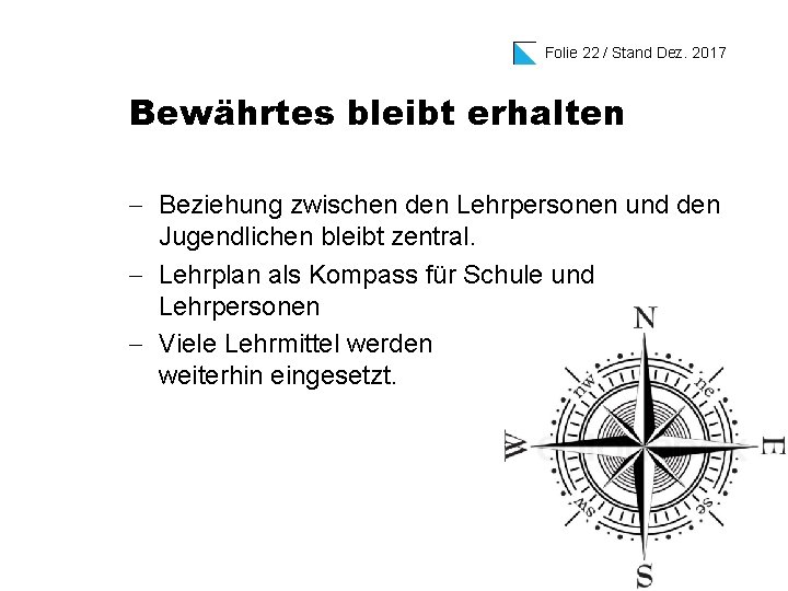 Folie 22 / Stand Dez. 2017 Bewährtes bleibt erhalten - Beziehung zwischen den Lehrpersonen und den Jugendlichen bleibt zentral. - Lehrplan als Kompass für Schule und Lehrpersonen - Viele Lehrmittel werden weiterhin eingesetzt.