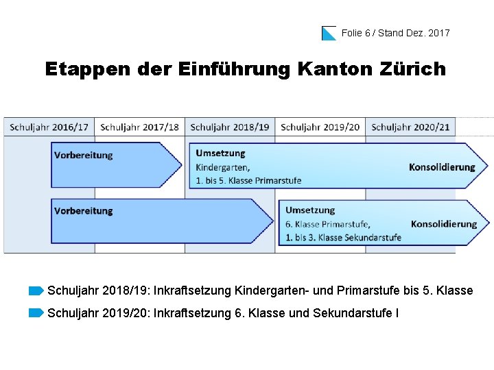 Folie 6 / Stand Dez. 2017 Etappen der Einführung Kanton Zürich Schuljahr 2018/19: Inkraftsetzung Kindergarten- und Primarstufe bis 5. Klasse Schuljahr 2019/20: Inkraftsetzung 6. Klasse und Sekundarstufe I