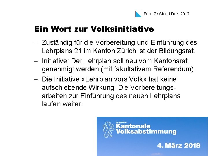 Folie 7 / Stand Dez. 2017 Ein Wort zur Volksinitiative - Zuständig für die Vorbereitung und Einführung des Lehrplans 21 im Kanton Zürich ist der Bildungsrat. - Initiative: Der Lehrplan soll neu vom Kantonsrat genehmigt werden (mit fakultativem Referendum). - Die Initiative «Lehrplan vors Volk» hat keine aufschiebende Wirkung: Die Vorbereitungsarbeiten zur Einführung des neuen Lehrplans laufen weiter.