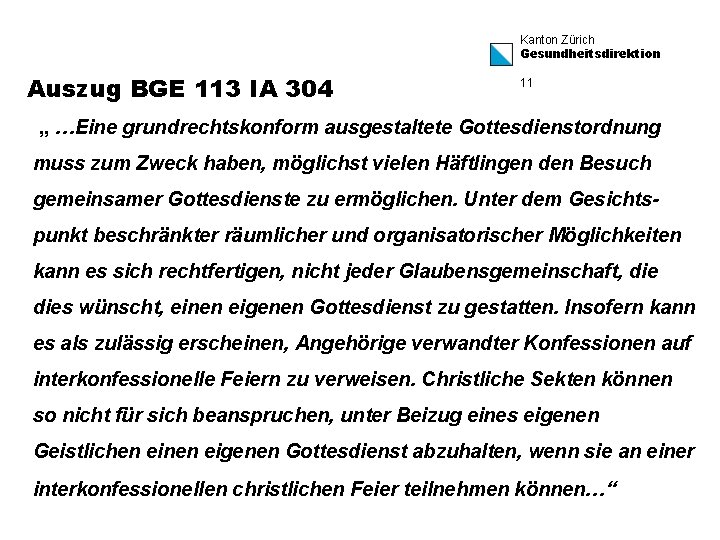 Kanton Zürich Gesundheitsdirektion Auszug BGE 113 IA 304 10 „Gerade hier, wo der weitgehende Entzug der Bewegungsfreiheit den Gefangenen hindert, die ihm verbleibenden Grundrechte selbstverantwortlich in Anspruch zu nehmen, und er sich in ausserordentlich grosser Abhängigkeit von den Vollzugsorganen befindet, muss sich die religiöse Neutralität des Staates bewähren. Dies führt dazu, dass die öffentlich-rechtliche Anerkennung einer Glaubensgemeinschaft als Landeskirche nicht zum Kriterium für die Zulässigkeit eines gemeinsamen Gottesdienstes gemacht werden darf…“