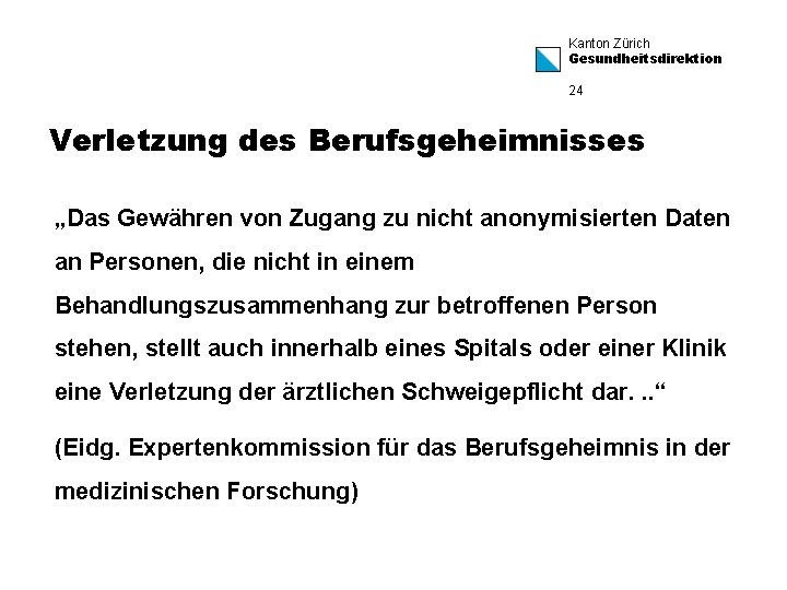 Kanton Zürich Gesundheitsdirektion 24 Verletzung des Berufsgeheimnisses „Das Gewähren von Zugang zu nicht anonymisierten Daten an Personen, die nicht in einem Behandlungszusammenhang zur betroffenen Person stehen, stellt auch innerhalb eines Spitals oder einer Klinik eine Verletzung der ärztlichen Schweigepflicht dar. . . “ (Eidg. Expertenkommission für das Berufsgeheimnis in der medizinischen Forschung)
