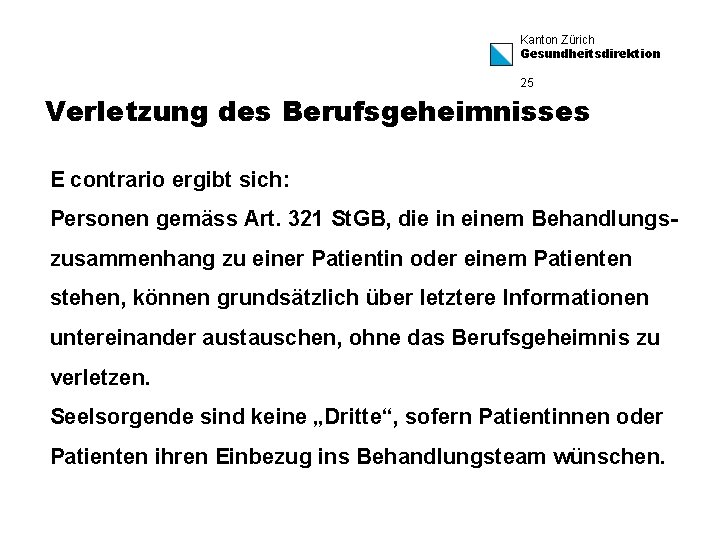 Kanton Zürich Gesundheitsdirektion Art. 321 Strafgesetzbuch 23 (Verletzung des Berufsgeheimnisses) 1. Geistliche, Rechtsanwälte, Verteidiger, Notare, Patentanwälte, nach Obligationenrecht zur Verschwiegenheit verpflichtete Revisoren, Ärzte, Zahnärzte, Apotheker, Hebammen sowie ihre Hilfspersonen, die ein Geheimnis offenbaren, das ihnen infolge ihres Berufes anvertraut worden ist oder das sie in dessen Ausübung wahrgenommen haben, werden, auf Antrag, mit Freiheitsstrafe bis zu drei Jahren oder Geldstrafe bestraft.