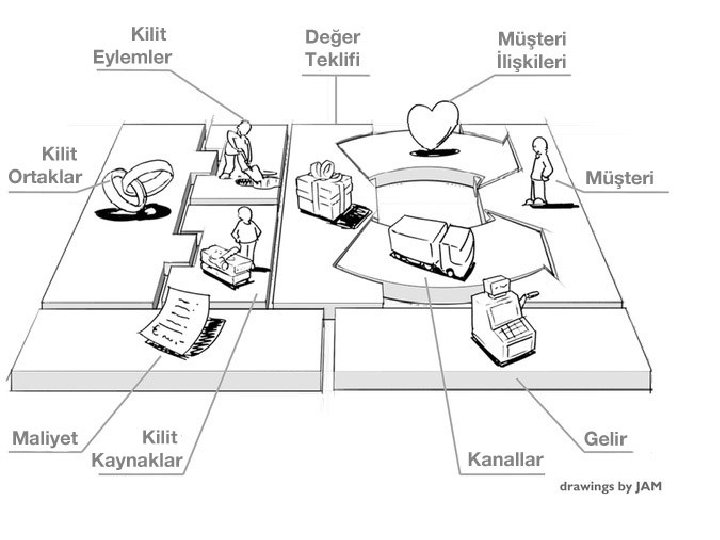 Alexander Osterwalder geliştirdiği “Kanvas İş Modeli “ 1. Değer Önerisi: Ürün ya da hizmetin özellikleri, müşteriye faydaları, rakiplerinden farklılıkları, pazarın tahmini büyüklüğü ve müşterilerden geri bildirim almak için kullanılabilecek en temel ürün prototipi. 2. Müşteri Segmentleri: Müşterileriniz kim ve ürününüz onların hangi sorununu çözüyor. 3. Kanallar: Ürününüzü satacağınız ve dağıtacağınız kanallar neler (Bayiler, internet, perakende gibi) 4. Müşteri İlişkileri: Nasıl talep yaratacaksınız? (Reklam, satış ekibi, markalaşma gibi) 5. Maliyet Yapısı: İşinizi yürütebilmek için katlanacağınız sabit ve değişken giderler (Personel, kira, üretim maliyetleri, dağıtım giderleri gibi) 6. Anahtar Aktiviteler: Şirketin başarılı olmak için çok iyi şekilde gerçekleştirmesi gereken faaliyetler (Üretim, markalaşma, satış, arge gibi) 7. Anahtar Kaynaklar: Tedarikçiler, hammadde ve diğer kritik gereksinimler 8. Anahtar Partnerler: İşinizde başarılı olmak için işbirliği kurmanız gereken kurumlar (Temsilcilikler, kamu kurumları, büyük distribütörler gibi) 9. Gelir Kaynakları: Ciro ve kar elde edeceğiniz kaynakları ve bunların tahmini büyüklükleri (Ürün satışı, hizmet gelirleri, üyelik gelirleri gibi)