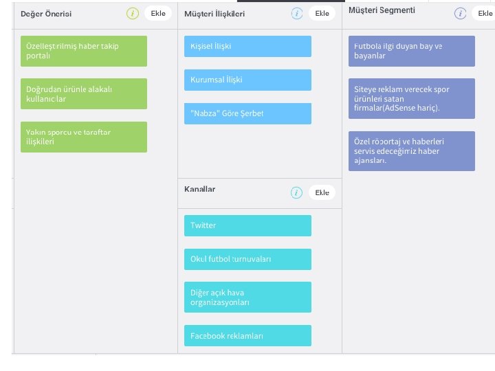 Kanvas Is Modeli İş fikriniz için atacağınız adımları netleştirmek, hedef kitlenizi belirlemek ve sunacağınız değer önerileri için nelere ihtiyacınız olduğunu belirlemeye karar verdiniz. Kanvas Is Modeli Alex Osterwalder tarafindan 2008 yılında gelistirilmis ve Eric Ries'in onderlik ettigi "Yalin Girisimcilik" akiminda kendine cok onemli yer edinmis bir Is Plani hazirlama aracidir. . . Cok basit olmasi ve herseyi bir arada gormeye imkan tanimasi kullanilabilirligine buyuk katkilar saglamaktadir. Haftalarca hatta aylarca uzerinde calisilmis ve ardindan cope atilacak (gercekci olmadigi icin) kapsamli bir Is Plani hazirlamak yerine basit ama kosullar degistikce veya yeni bilgiler elde edildikce uyarlamalar yapilacak bir model bircok girisimciye cok daha kullanisli gelmeye baslamistir.