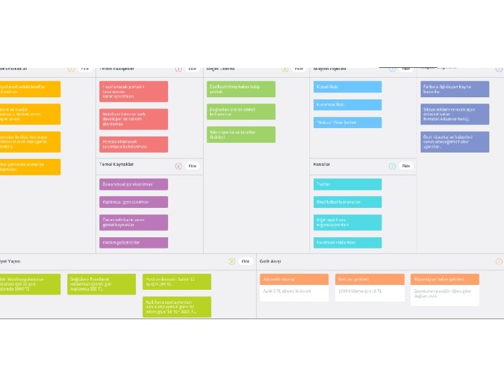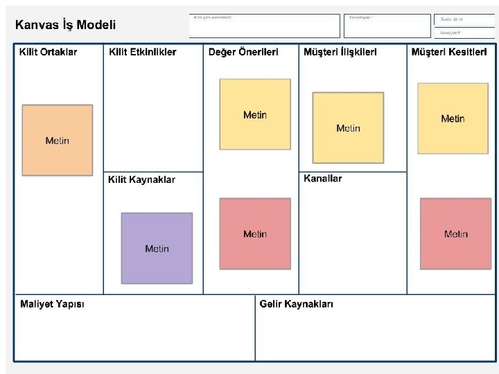 İş modelinizi çıkartırken post-it’ler ile çalışmanızı öneririz. Bu sayede kolaylıkla istediğiniz sütuna istediğinizi yazıp çıkarabilme şansına sahip olabilirsiniz.