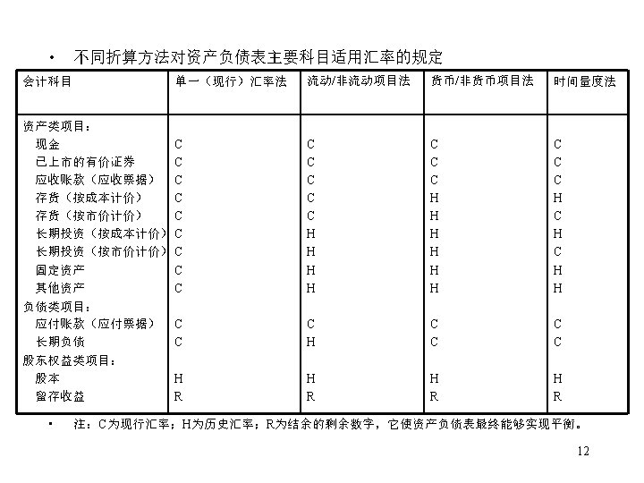 • 4. Current rate method (Stichtagskursmethode, 现行汇率 法,期末汇率法、单一汇率法):Alle Bilanz- und Einnahmen- und Ausgabenposten werden mit dem aktuellen Wechselkurs (Stichtagskurs) umgerechnet=> wird oft von britischen UN verwendet =>bei Verwendung dieser Methode fuehrt Abwertung (Aufwertung) der Auslandswaehrung immer zu Verlust (Gewinn), wenn die in Auslandswaehrungen denominierten assets die liabilities uebersteigen. 11
